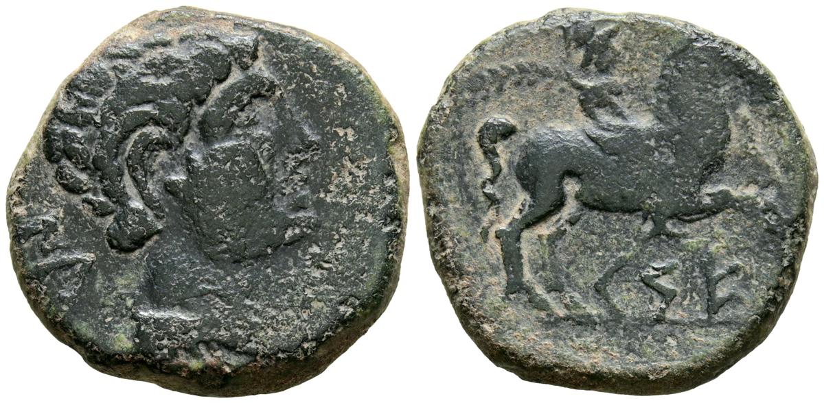 CESE (Tarragona). As. (Ae. 9,69g/24mm). 120-20 a.C. (FAB-2295). Anv: Cabeza masculina a derecha, detrás letras ibéricas: IL, delante S. Rev: Jinete con palma a derecha, debajo leyenda ibérica: CeSE. MBC-.