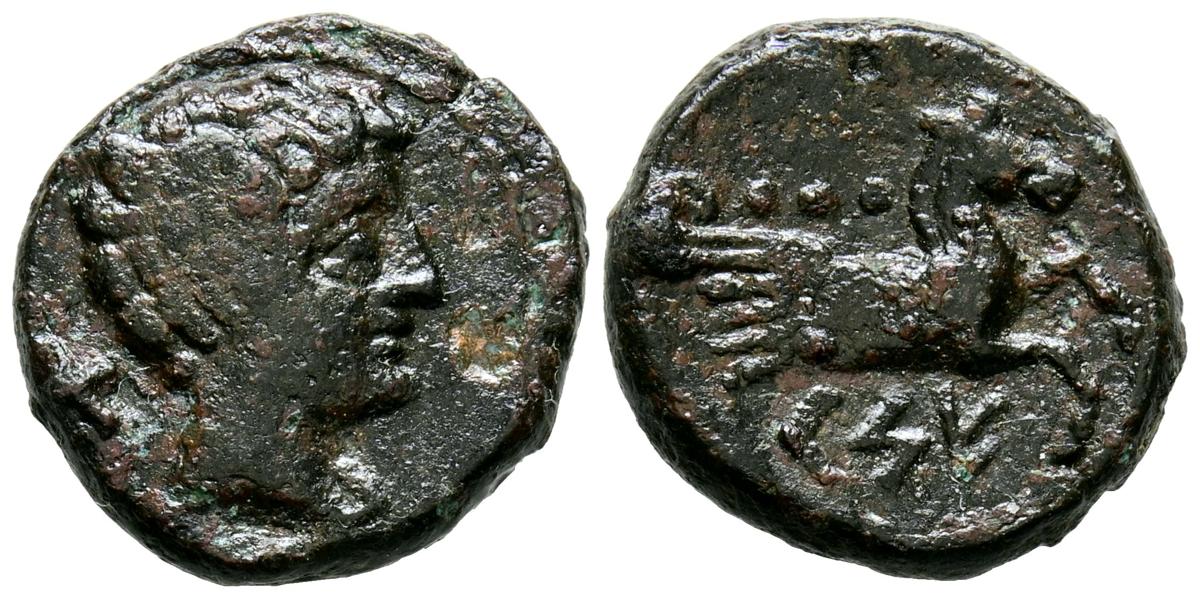 CESE (Tarragona). Cuadrante. (Ae. 3,48g/16mm). 120-20 a.C. (FAB-2334). Anv: Cabeza masculina a derecha, detrás letra ibérica Ta. Rev: parte delantera de pegaso, encima tres puntos, debajo leyenda ibérica CeSE. MBC.