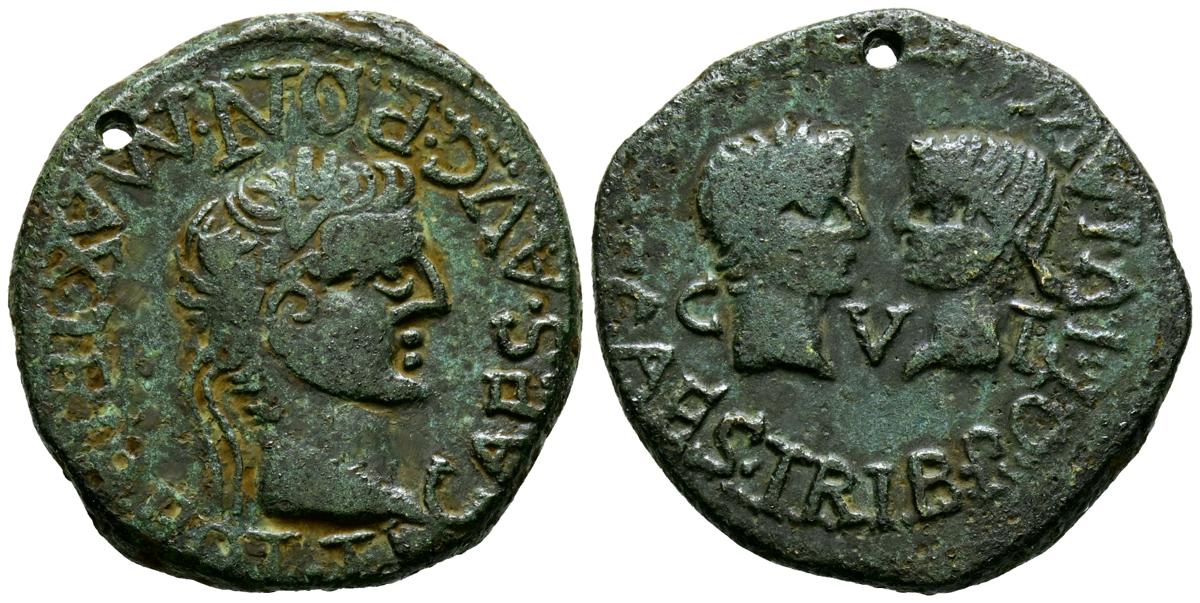 TARRACO (Tarragona). As. (Ae. 8,63g/21mm). 27 a.C.-14 d.C. (FAB-2356). Anv: Cabeza laureada de Augusto a derecha, alrededor leyenda: IMP CAES AVG TR PONT MAX P P. Rev: Cabezas de Cayo y Lucio enfrentadas, entre ellas: CVT, encima: CL CAES, debajo: AVG F. MBC-. Perforación.
