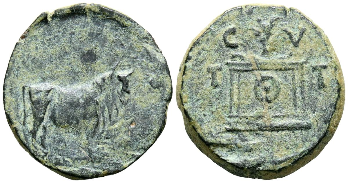 TARRACO (Tarragona). Semis. (Ae. 4,62g/21mm). 14-36 d.C. (FAB-2377). Anv: Toro a derecha. Rev: Ara, alrededor leyenda: CVTT. MBC.