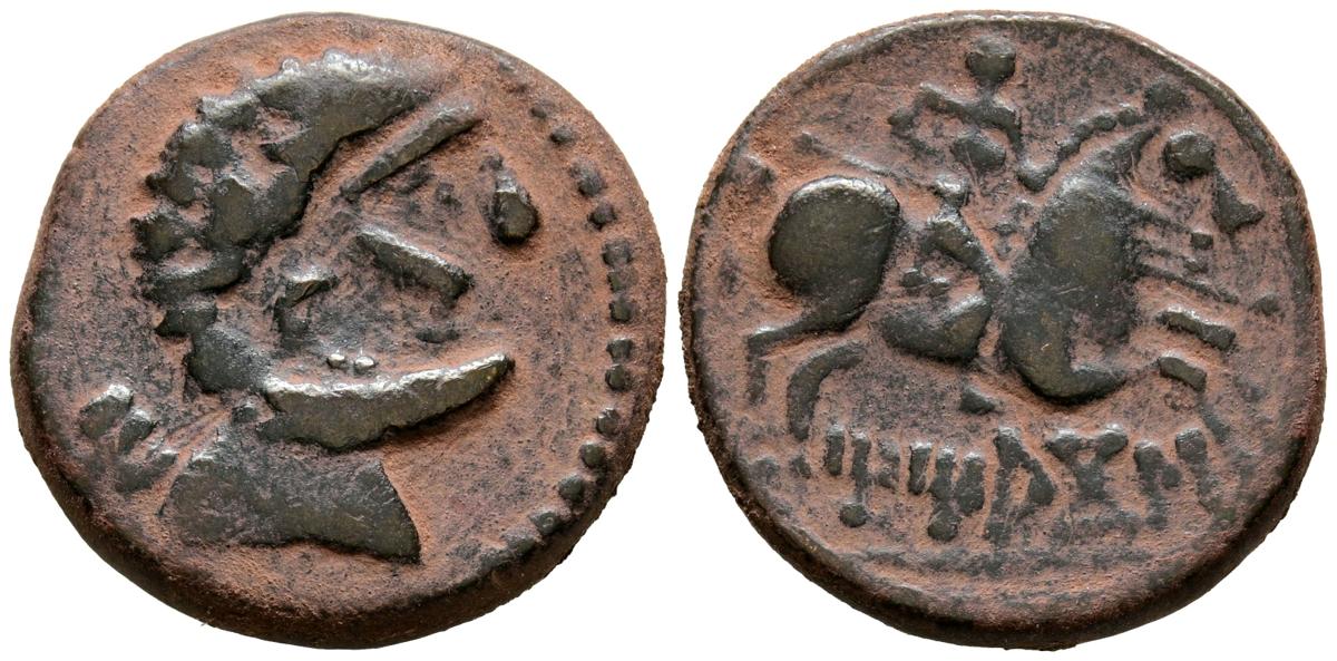 TITIACOS (Tricio, La Rioja). As. (Ae. 7,31g/24mm). 120-20 a.C. (FAB-2395). Anv: Cabeza masculina barbada a derecha, detrás letra ibérica: Ti. Rev: Jinete con lanza a derecha, debajo leyenda ibérica curva sobre línea: TiTiACoS. MBC-.