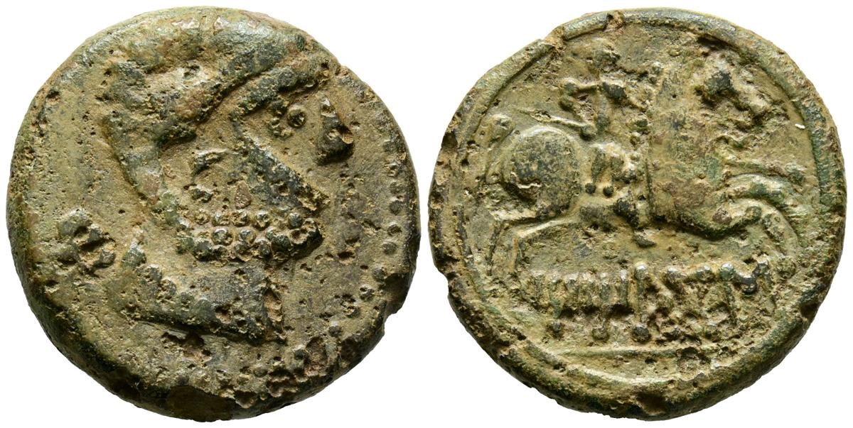 TITIACOS (Tricio, La Rioja). As. (Ae. 9,74g/24mm). 120-20 a.C. (FAB-2395). Anv: Cabeza masculina barbada a derecha, detrás letra ibérica: Ti. Rev: Jinete con lanza a derecha, debajo leyenda ibérica sobre linea: TiTiACoS. MBC.