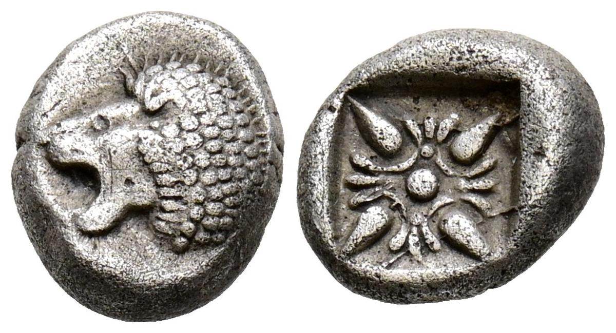 JONIA, Miletos. Dióbolo. (Ar. 1,14g/10mm). 600-500 a.C. (SNG Kayhan 476-81). Anv: Cabeza de leon a izquierda. Rev: Diseño estrellado incuso. MBC.