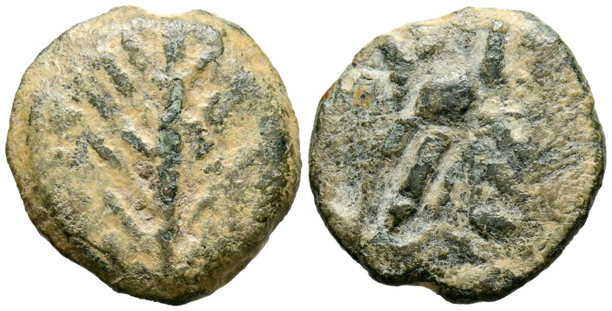 UCIA (Cabezas de San Juan, Sevilla). Semis. (Ae. 4,98g/18mm). 50 a.C.-20 d.C. (FAB-2478). Anv: Palma, a la derecha S. Rev: Leyenda: VCIA, alrededor de punto. MBC-.