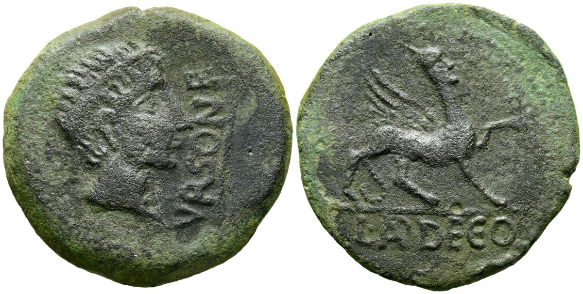 URSONE (Osuna, Sevilla). As. (Ae. 20,76g/36mm). 50 a.C. (FAB-2499). Anv: Cabeza masculina laureada a derecha, delante leyenda: VRSONE. Rev: Esfinge a derecha, debajo leyenda en cartela: LADECO. MBC-.
