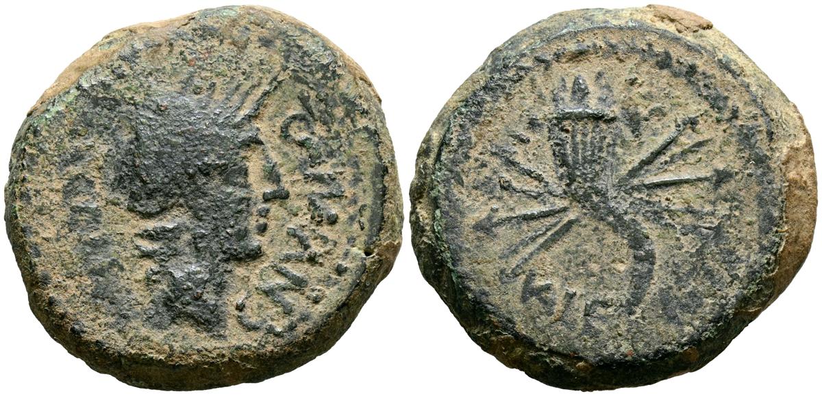 VALENTIA (Valencia). As. (Ae. 30,23g/32mm). 150-50 a.C. (FAB-2510). Anv: Cabeza galeada de Roma a derecha, alrededor leyenda: C MVNI Q C LVCIEN. Rev: Cornucopia sobre fúlmen, debajo leyenda: VALENTIA, dentro de corona de laurel. MBC. Escaso ejemplar.