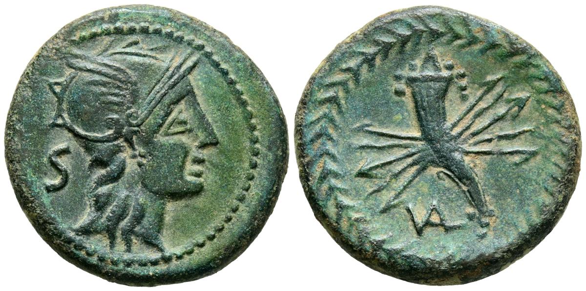VALENTIA (Valencia). Semis. (Ae. 8,37g/23mm). 150-50 a.C. (FAB-2513). Anv: Cabeza galeada de Roma a derecha, detrás S. Rev: Cornucopia sobre fúlmen, en campo monograma: VAL, dentro de corona de laurel. MBC+. Pátina verde. Escaso ejemplar.