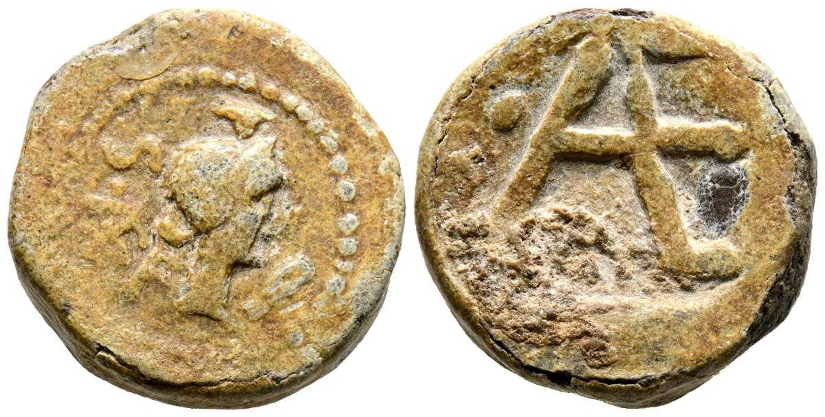 Plomo monetiforme. (Pb. 7,35g/18mm). Anv: Cabeza femenina a derecha, detrás leyenda: SAEF. Rev: Monograma AE. MBC.