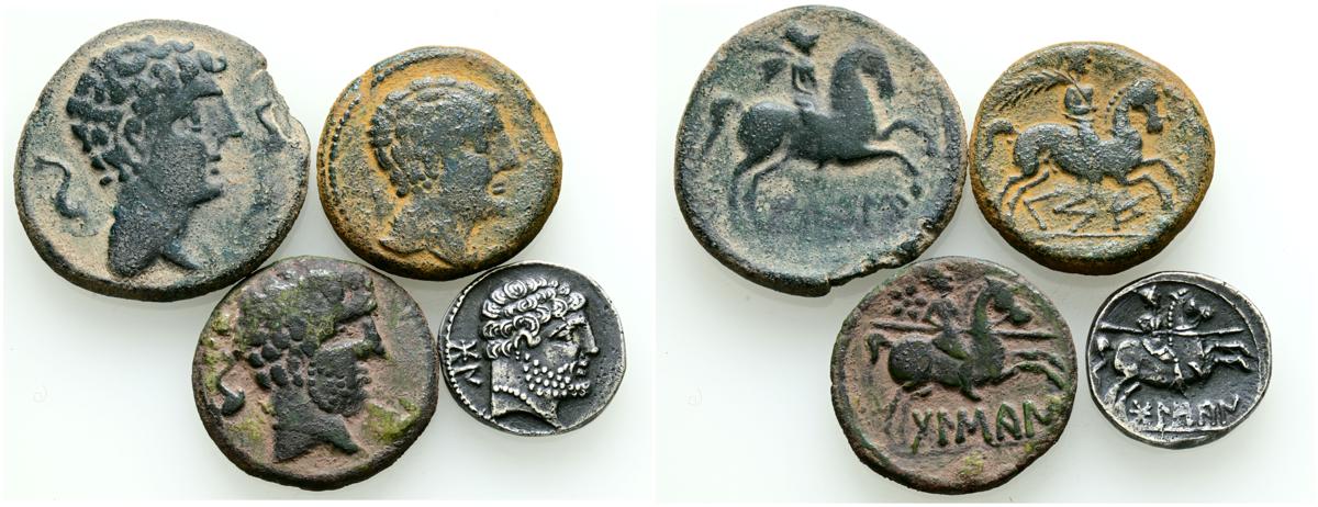 Conjunto de 4 monedas ibéricas conteniendo, 3 bronces de distintas cecas y un denario de Bolscan. IMPRESCINDIBLE EXAMINAR.