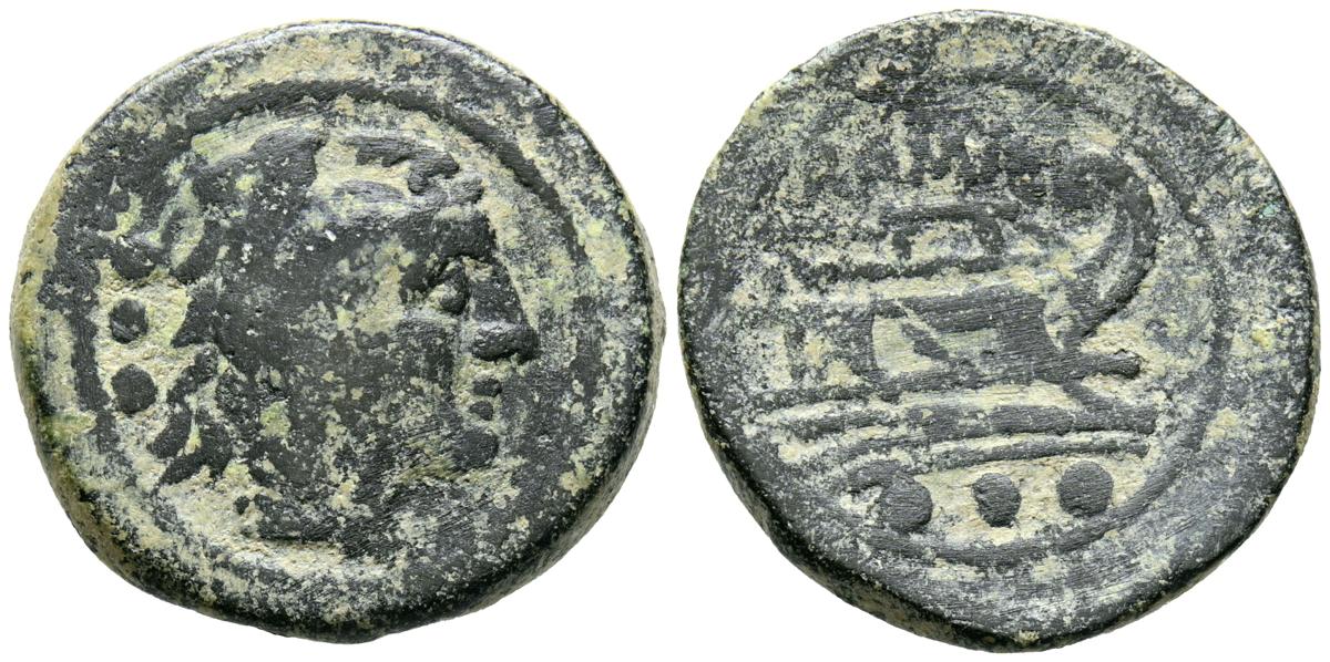 ACUÑACIONES ANONIMAS. Cuadrante. (Ae. 7,29g/23mm). 211 a.C. Roma. (Crawford 56/5). Anv: Cabeza de Hercules con piel de león a derecha, detrás tres puntos. Rev: Proa a derecha, encima leyenda: ROMA, debajo tres puntos. MBC-.