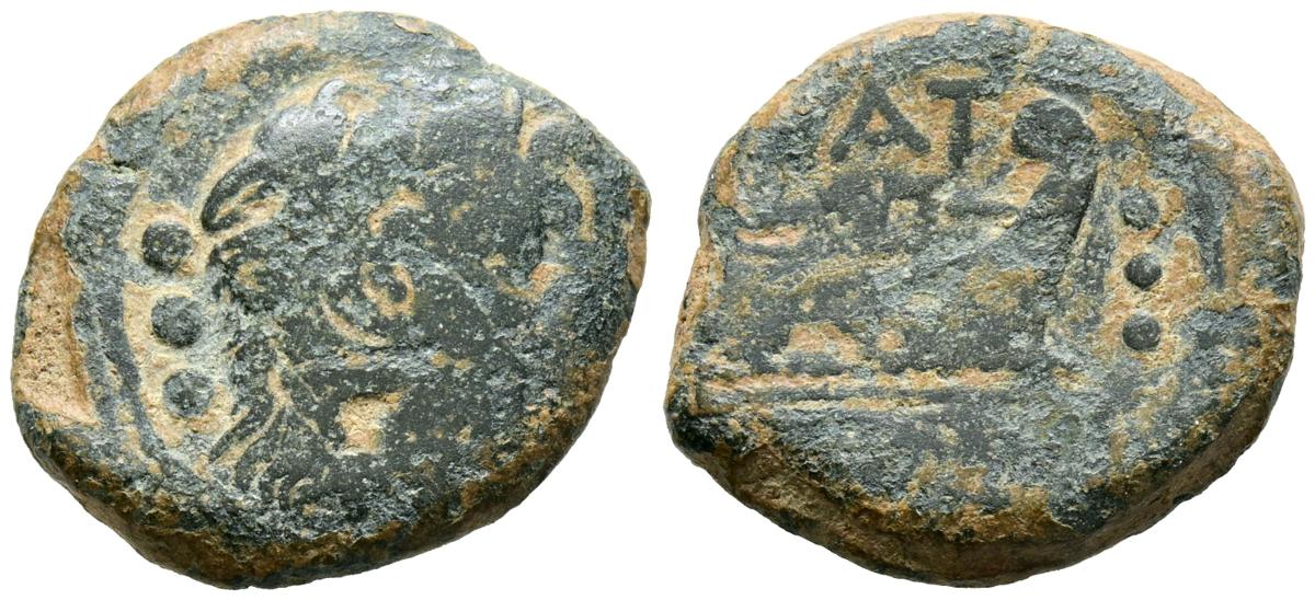 ACUÑACIONES ANONIMAS. Cuadrante. (Ae. 6,76g/20mm). 211 a.C. Roma. (Crawford 56/5 var). Anv: Cabeza de heracles con piel de león a derecha, detrás tres puntos. Rev: Proa a derecha, encima AT, delante tres puntos, debajo ROMA. MBC-.