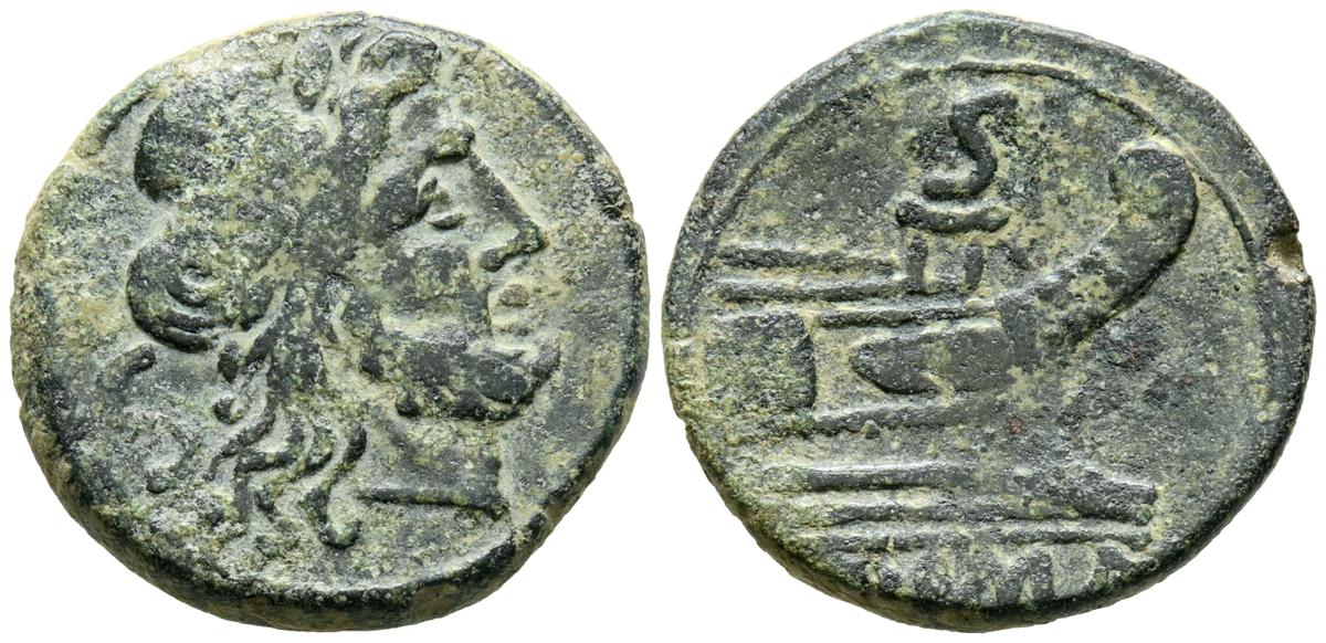 ACUÑACIONES ANONIMAS. Semis. (Ae. 6,65g/22mm). 211 a.C. Roma. (Crawford 56/3). Anv: Cabeza laureada de Saturno a derecha, detrás S. Rev: Proa a derecha, encima S, debajo leyenda: ROMA. MBC-.