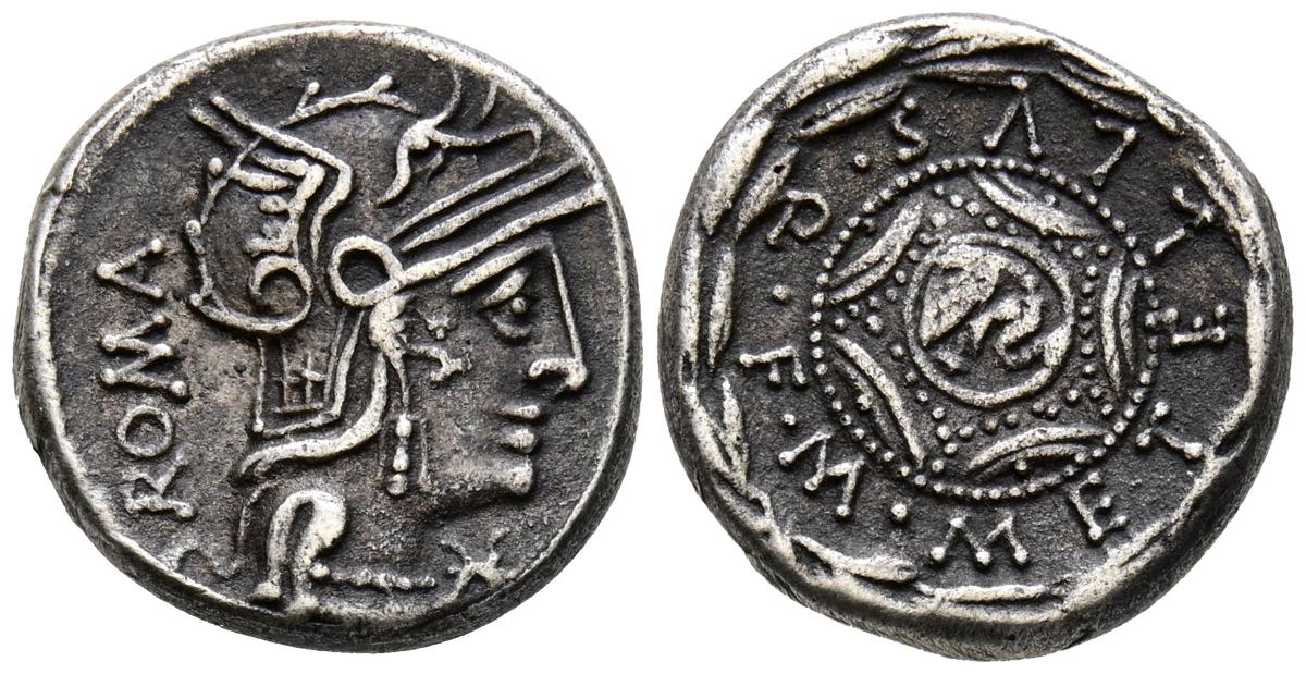 GENS CAECILIA. Denario. (Ar. 3,46g/17mm). 127 a.C. Roma. (Crawford 263/1a; FFC 205). Anv: Cabeza de Roma a derecha, delante estrella, detrás leyenda de abajo hacia arriba: ROMA. Rev: Escudo macedonio, alredor leyenda dentro de corona de laurel: M METELLVS Q F. MBC+.