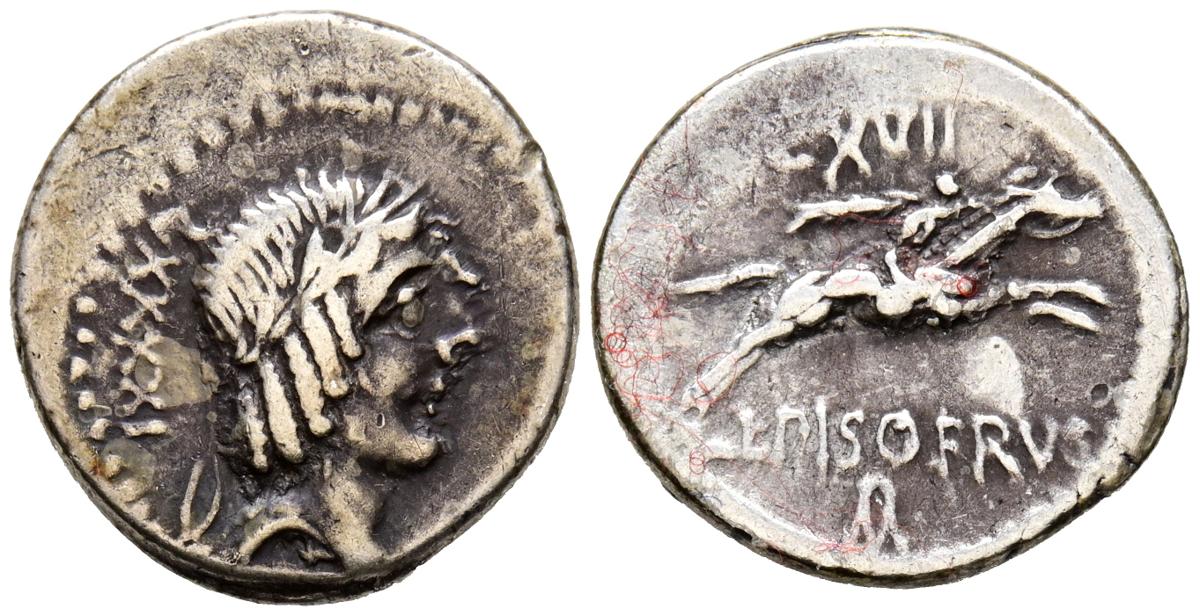 GENS CALPURNIA. Denario. (Ar. 3,87g/19mm). 90-89 a.C. Roma. (Crawford 340/1; FFC 240). Anv: Cabeza laureada de Apolo a derecha, detrás número: LXXXXI. Rev: Jinete con palma galopando a derecha, debajo leyenda: L PISO FRVGI, encima número: LXVII, debajo de leyenda monograma ROMA. MBC.