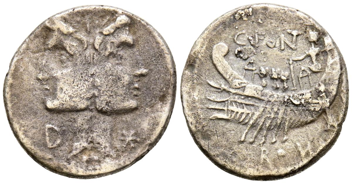GENS FONTEIA. Denario. (Ar. 3,40g/19mm). 114-113 a.C. Sur de Italia. (Crawford 290/1; FFC 713). Anv: Cabeza de bifronte de Fontus, en campo: P y estrella. Rev: Galera a izquierda con timonel y tres filas de remeros, encima leyenda: C FONT, debajo: ROMA. BC+. Oxidaciones limpiadas.