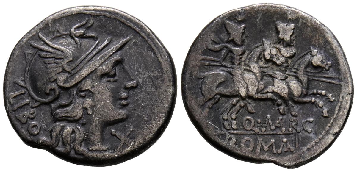 GENS MARCIA. Denario. (Ar. 3,74g/19mm). 148 a.C. Roma. (FFC 848; Crawford 215/1). Anv: Cabeza de Roma a derecha, delante X, detrás leyenda: LIBO. Rev: Los Dioscuros a caballo a derecha, encima estrellas, debajo leyenda: Q MARC, en exergo: ROMA. MBC-.