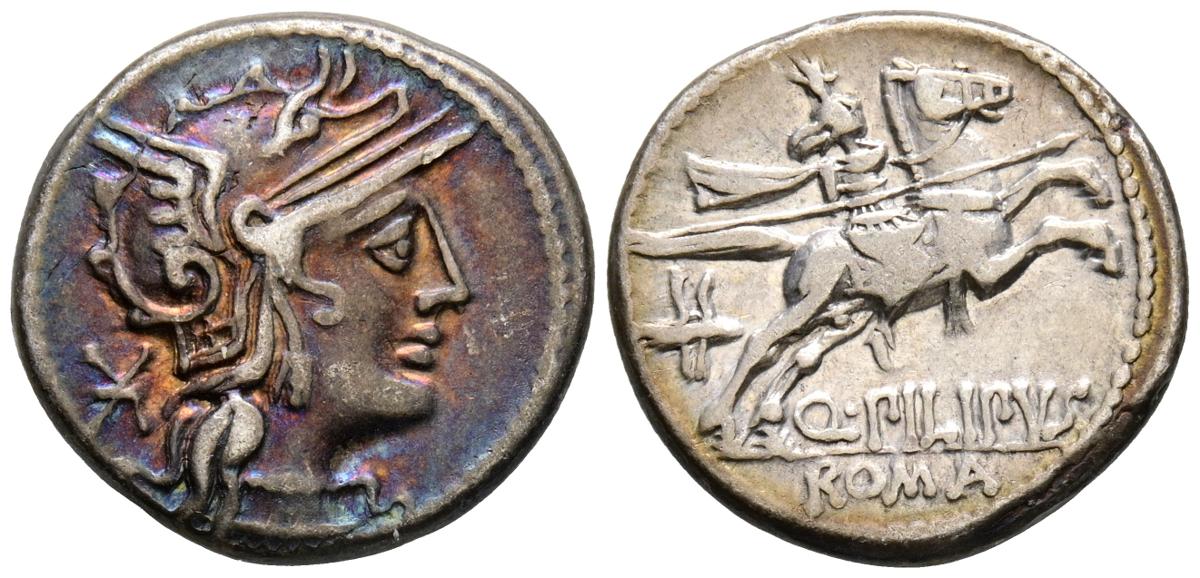 GENS MARCIA. Denario. (Ar. 3,98g/18mm). 148 a.C. Roma. (Crawford 259/1; FFC 849). Anv: Cabeza de Roma a derecha, detrás estrella. Rev: Jinete con lanza y casco macedonia a derecha, debajo leyenda: Q PILIPVS, en exergo: ROMA. MBC+. Pátina irisada en anverso.