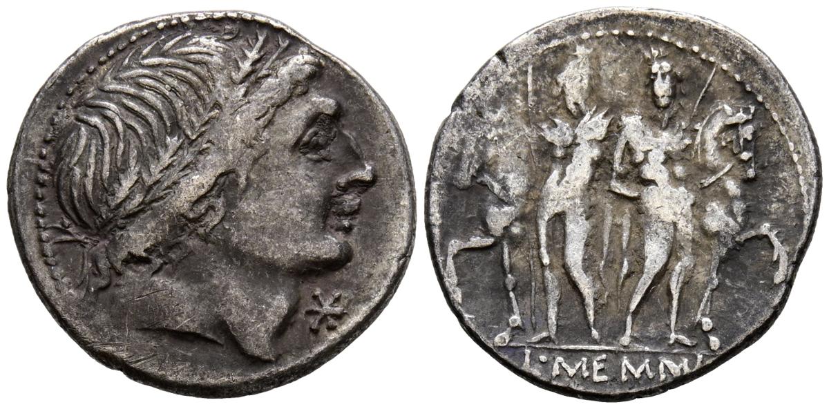 GENS MEMMIA. Denario. (Ar. 3,93g/20mm). 109-108 a.C. Sureste de Italia. (FFC 906; Crawford 304/1). Anv: Cabeza varonil laureada a derecha, delante estrella. Rev: Los Dioscuros estantes de frente, sosteniendo las bridas de sus caballos, en exergo: L MEMMI. MBC.