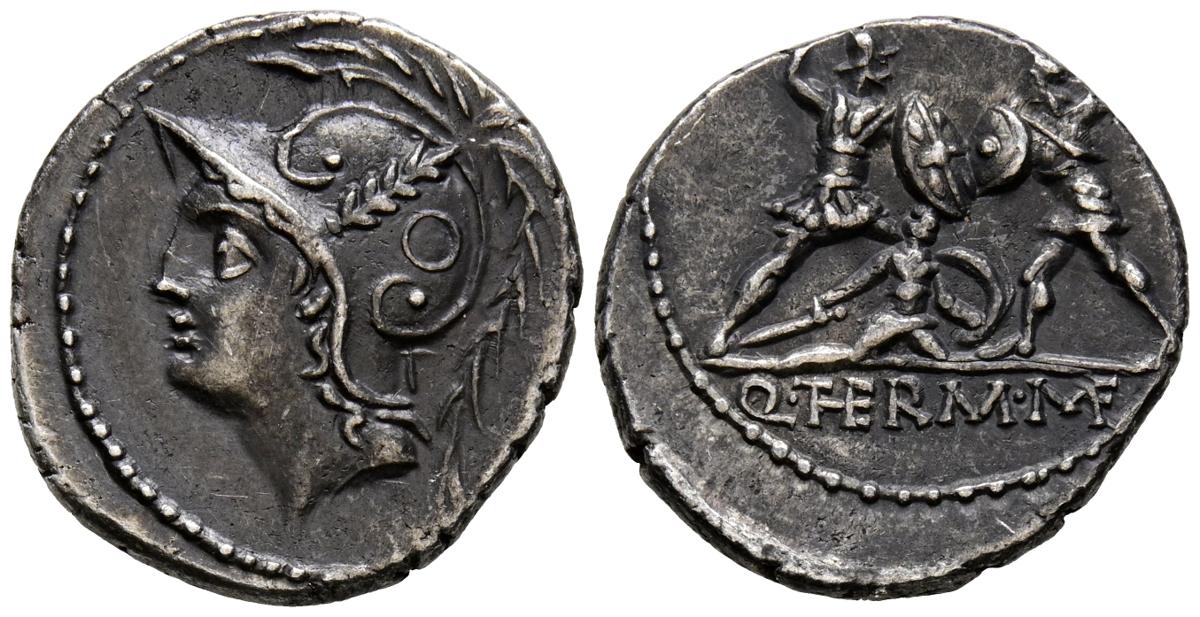 GENS MINUCIA. Denario. (Ar. 3,89g/19mm). 103 a.C. Roma. (Crawford 319/1; FFC 928). Anv: Cabeza de Marte a izquierda. Rev: Dos soldados luchando entre ellos, otro caído en el suelo, en exergo: Q THERM MF. MBC/MBC+. Pátina oscura.