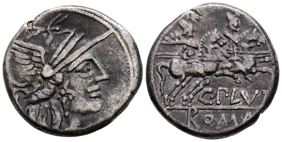 GENS PLUTIA. Denario. (Ar. 3,85g/18mm). 121 a.C. Taller auxiliar de Roma. (Crawford 278/1; FFC 1009). Anv: Cabeza de Roma a derecha, detrás X. Rev: Dioscuros sobre caballo a derecha, encima estrellas, debajo leyenda: C PLVTI, en exergo: ROMA. MBC-.