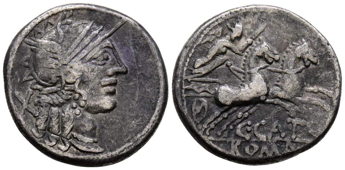 GENS PORCIA. Denario. (Ar. 3,87g/19mm). 123 a.C. Taller auxiliar de Roma. (FFC 1050; Crawford 274/1). Anv: Cabeza de Roma a derecha, detrás X. Rev: Victoria con látigo en biga a derecha, denajo leyenda: C CATO, en exergo: ROMA. MBC-.