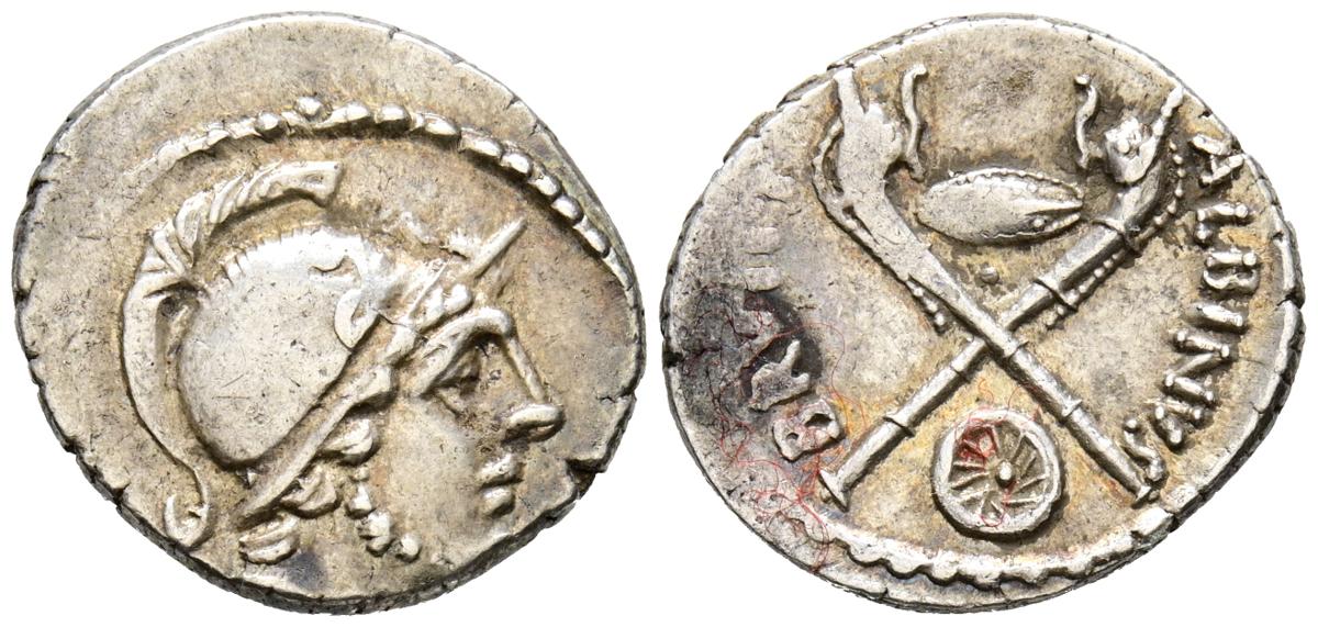 GENS POSTUMIA. Denario. (Ar. 3,46g/18mm). 48 a.C. Roma. (Crawford 450/1; FFC 1076). Anv: Cabeza de Marte con casco a derecha. Rev: Dos carnyx entrelazadas, encima escudo ovalado y debajo escudo redondo, alrededor leyenda: ALBINVS BRVTI F. EBC. Anverso descentrado.