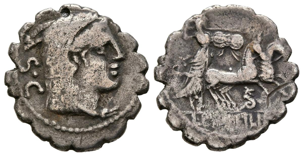 GENS PROCILIA. Denario. (Ar. 3,47g/18mm). 80 a.C. Sur de Italia. (Crawford 379/2; FFC 1082). Anv: Cabeza de Juno Sospita con piel de cabra a derecha, detrás: SC. Rev: El mismo personaje con escudo y lanza en biga a derecha, debajo serpiente, en exergo: L PROCILI F. MBC-.