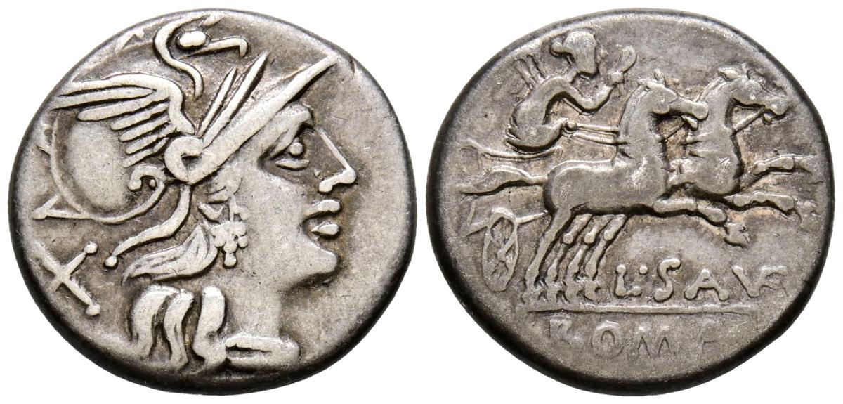 GENS SAUFEIA. Denario. (Ar. 3,63g/17mm). 152 a.C. Roma. (FFC 1099; Crawford 204/1). Anv: Cabeza de Roma a derecha, detrás X. Rev: Victoria con corona en biga a derecha, debajo leyenda: L SAVF, en exergo: ROMA. MBC-.