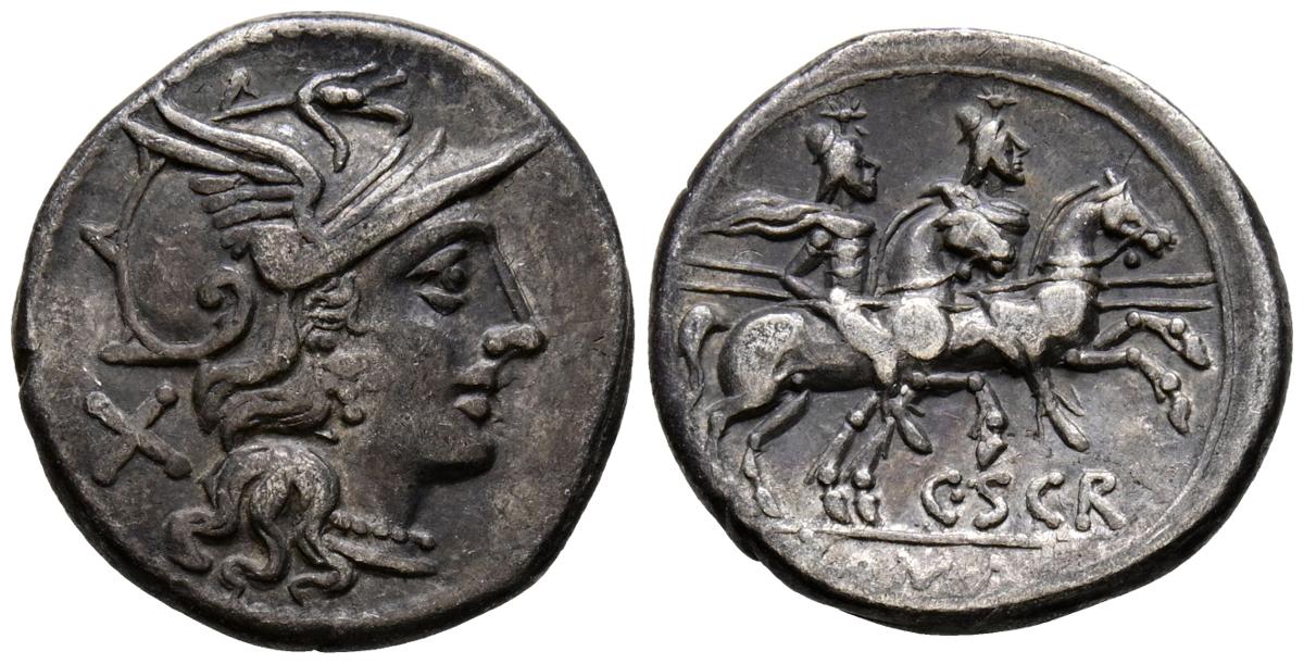GENS SCRIBONIA. Denario. (Ar. 3,93g/19mm). 154 a.C. Roma. (Crawford 201/1; FFC 1100). Anv: Cabeza de Roma a derecha, detrás X. Rev: Los Dioscuros a caballos a derecha, encima estrellas, debajo leyenda: C SCR, en exergo: ROMA. MBC/MBC+.