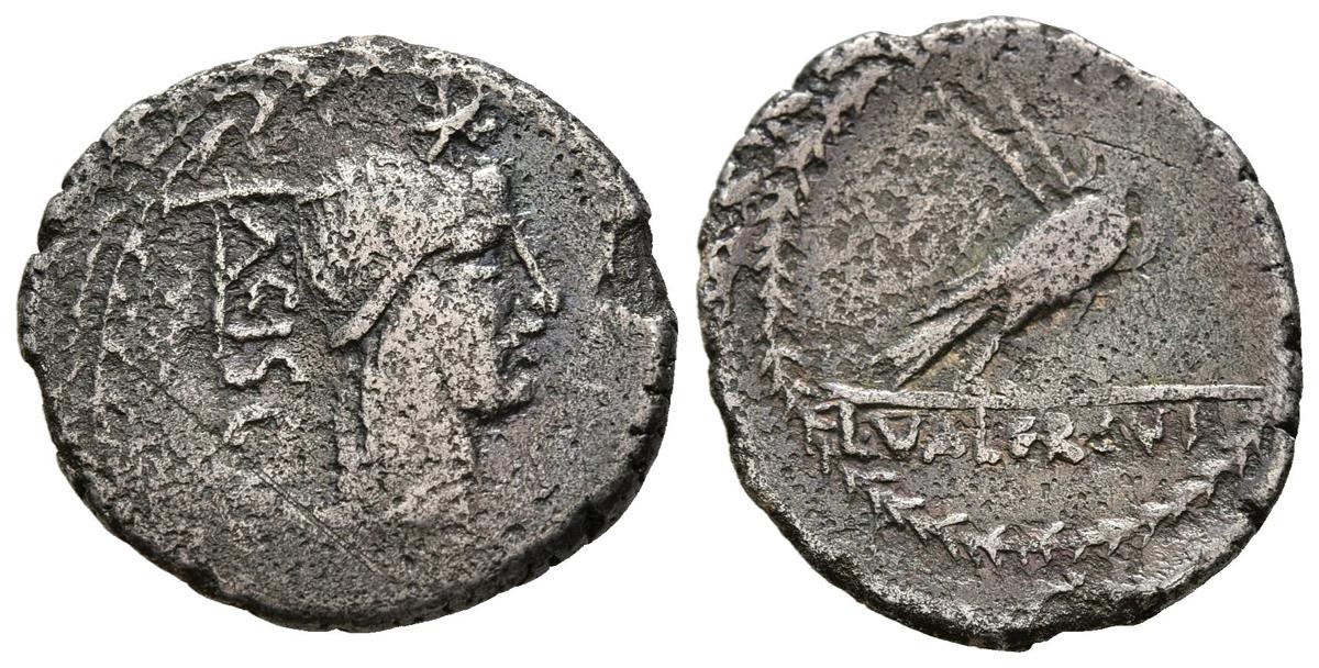 GENS VALERIA. Denario. (Ar. 3,21g/20mm). 45 a.C. Roma. (Crawford 474/2; FFC 1179). Anv: Cabeza laureada de Apolo a derecha, encima estrella, detrás martillo y leyenda: ACISCVLVS. Rev: Sirena con cuerpo de águila y cabeza de Minerva con casco a derecha portando escudo y dos lanzas, en exergo: L VALERIVS, todo dentro de corona de laurel. MBC-. Oxidaciones limpiadas.