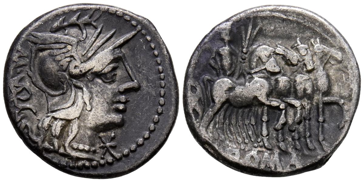 GENS VARGUNTEIA. Denario. (Ar. 3,84g/20mm). 130 a.C. Roma. (FFC 1183; Crawford 257/1). Anv: Cabeza de Roma a derecha, delante estrella, detrás leyenda: M VARG. Rev: Júpiter en cuádriga a derecha con rama de palma y haz de rayos, en exergo: ROMA. MBC/MBC-.
