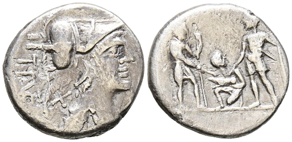 GENS VETURIA. Denario. (Ar. 3,51g/19mm). 137 a.C. Italia central. (Crawford 234/1; FFC 1186). Anv: Cabeza de Marte a derecha, detrás X y leyenda: TI VET. Rev: Cerdo en brazos de sacerdote arrodillado entre dos soldados con lanzas y espadas, encima leyenda: ROMA. MBC-.