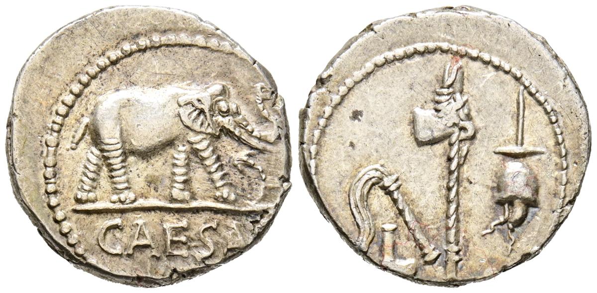 JULIO CESAR. Denario. (Ar. 3,83g/18mm). 54-51 a.C. Ceca militar móvil. (Crawford 443/1; FFC 50). Anv: Elefante avanzando a derecha, delante serpiente, debajo leyenda: CAESAR. Rev: Símpulo, aspersorio, hacha y apex. EBC. Restos de brillo original. Bonito y escaso ejemplar.
