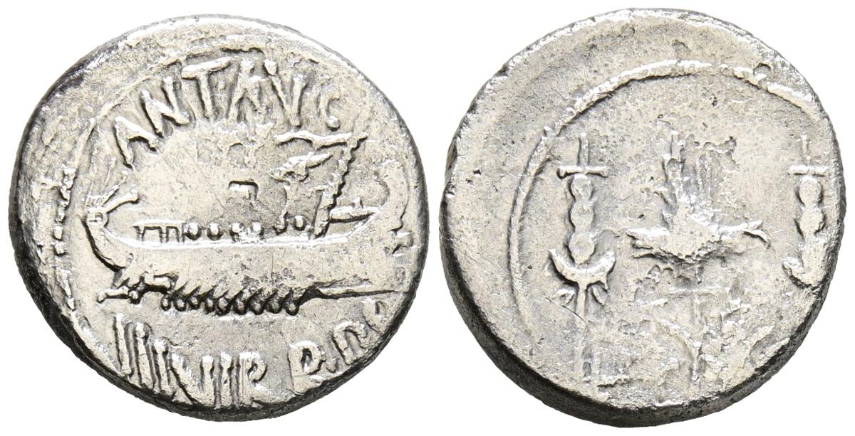 MARCO ANTONIO. Denario. (Ar. 3,64g/18mm). 32-31 a.C. Ceca volante. (Crawford 544). Anv: Galera Pretoriana a derecha, alrededor leyenda: ANT AVG III VIR RPC. Rev: Aguila legionaria entre dos estandartes, entre ellas: LEG. MBC/BC. Oxidaciones limpiadas.