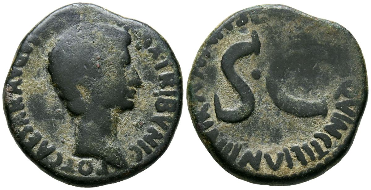 AUGUSTO. As. (Ae. 9,78g/25mm). 6 d.C. Roma. (RIC 439). Anv: Cabeza de Augusto a derecha, alrededor leyenda: CAESAR AVGVST PONT MAX TRIBVNI C POT. Rev: SC, alrededor leyenda: SX NONIVS Q VINCTILIAN III VIR. BC+.