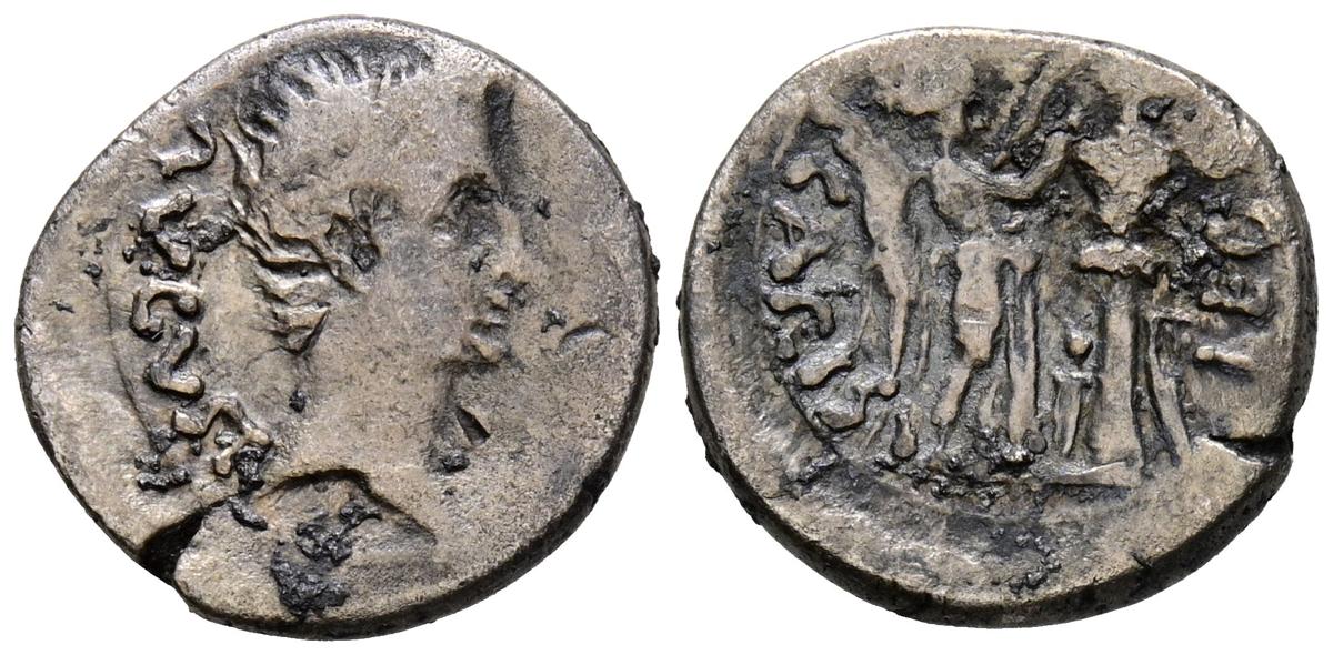 AUGUSTO. Quinario. (Ar. 1,60g/15mm). 25-23 a.C. Emérita Augusta. (RIC 1a). Anv: Cabeza de Augusto a izquierda, detrás leyenda: AVGVSTVS. Rev: Victoria estante a derecha coronando trofeo, alrededor leyenda: P CARISI LEG. MBC.