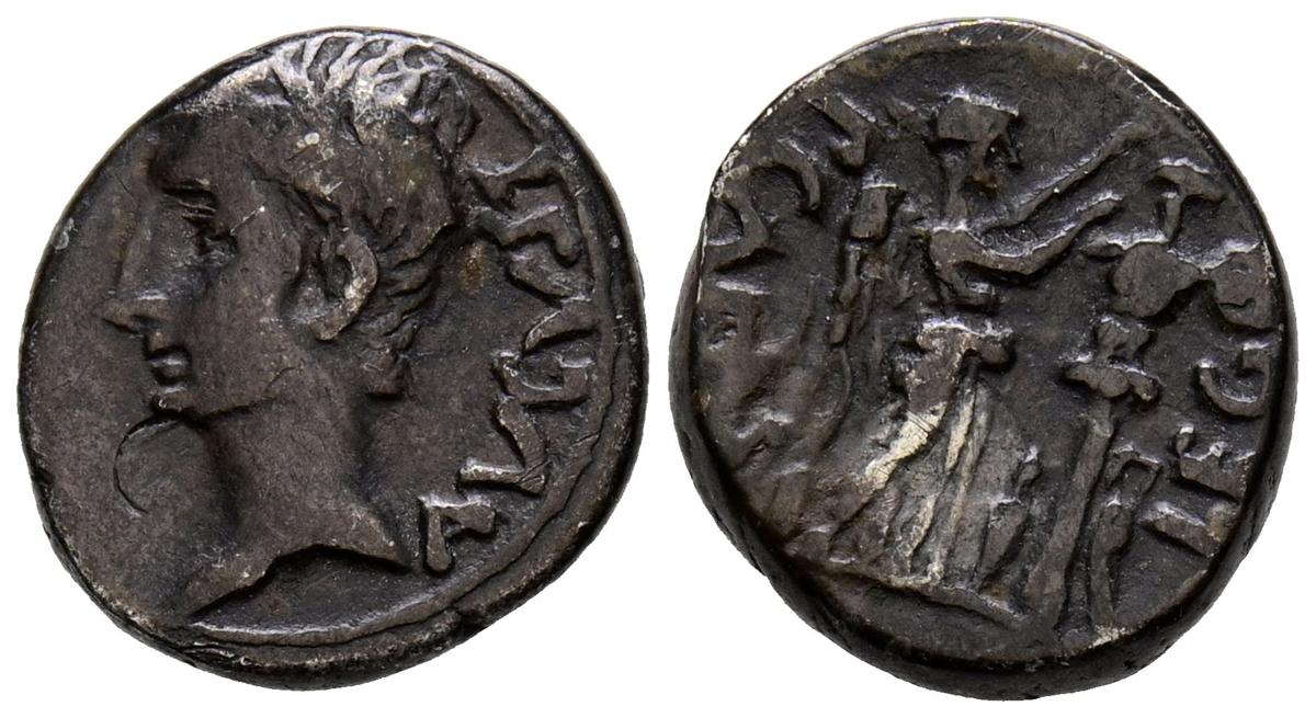 AUGUSTO. Quinario. (Ar. 1,89g/13mm). 25-23 a.C. Emérita Augusta. (RIC 1b). Anv: Cabeza de Augusto a izquierda, detrás leyenda: AVGVSTVS. Rev: Victoria estante a derecha coronando trofeo, alrededor leyenda: P CARISI LEG. MBC.