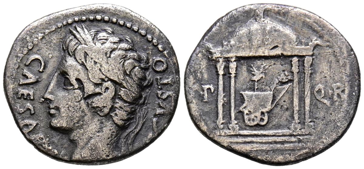 AUGUSTO. Denario. (Ar. 3,43g/19mm). 18 a.C. Colonia Patricia. (RIC 120). Anv: Cabeza laureada de Augusto a izquierda, alrededor leyenda: CAESARI AVGVSTO. Rev: Carruaje triunfal con águila dentro de templo tetrástilo, entre: SP-QR. MBC-.