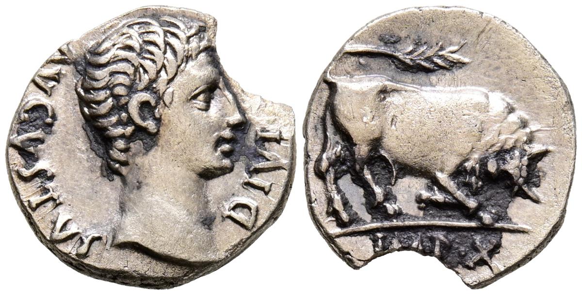 AUGUSTO. Denario. (Ar. 3,52g/17mm). 15-13 a.C. Lugdunum. (RIC 167a). Anv: Cabeza de Augusto a derecha, alrededor leyenda: AVGVSTVS DIVI F. Rev: Toro embistiendo a derecha, en exergo: IMP X. MBC+. Partido. Escaso ejemplar.