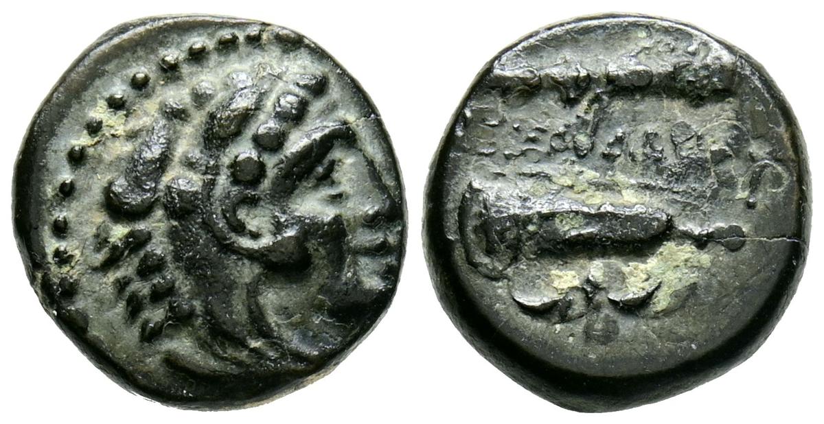 REYES DE MACEDONIA, Alejandro III el Grande. 1/4 Unidad. (Ae. 1,72g/12mm). 336-323 a.C. Anv: Cabeza de Heracles con piel de león a derecha. Rev: Leyenda griega entre mazo y carcaj. MBC.