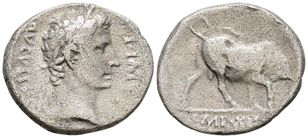 AUGUSTO. Denario. (Ar. 3,52g/19mm). 11-10 a.C. Lugdunum. (RIC 187a). Anv: Cabeza laureada de Augusto a derecha, alrededor leyenda: AVGVSTVS DIVI F. Rev: Toro embistiendo a derecha, en exergo: IMP XII. MBC-.