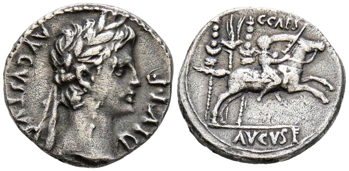 AUGUSTO. Denario. (Ar. 3,67g/18mm). 8 d.C. Lugdunum. (RIC 199). Anv: Cabeza laureada de Augusto a derecha, alrededor leyenda: AVGVSTVS DIVI F. Rev: Cayo César sobre caballo con espada, detrás estandartes, encima: C CAES, en exergo: AVGVS F. MBC.