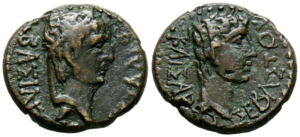 AUGUSTO y TIBERIO. Semis. (Ae. 4,56g/19mm). 4-10 a.C. Tesalónica. (RPC 1565). Anv: Cabeza laureada de Augusto a derecha, alrededor leyenda. Rev: Cabeza de Tiberio a derecha, alrededor leyenda. MBC.