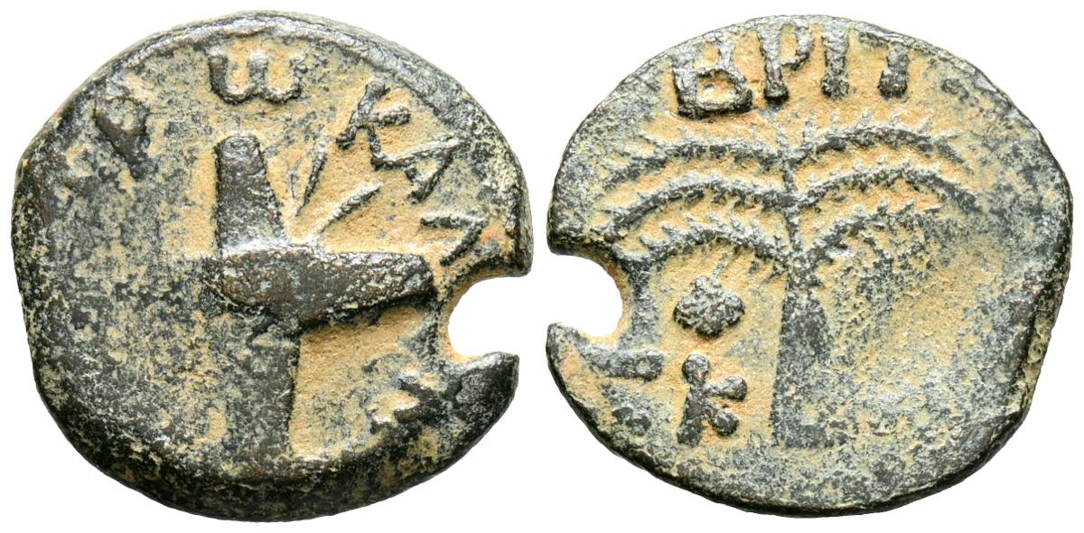 JUDAEA, Antonio Félix. Prutah. (Ae. 2,67g/17mm). 52-59 d.C. Jerusalén. (RPC 4971). Anv: Dos escudos cruzados sobre dos lanzas cruzadas, alrededor leyenda. Rev: Palmera con frutos colgando, alrededor leyenda. MBC.