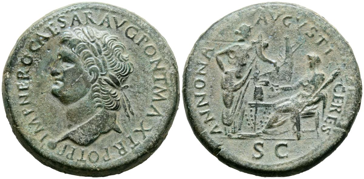 NERON. Sestercio. (Ae. 29,77g/36mm). 65 d.C. Roma. (RIC 572). Anv: Cabeza laureada de Nerón a izquierda, alrededor leyenda: IMP NERO CAESAR AVG P MAX TR POT P P. Rev: Annona estante a derecha portando cornucopia, en frente Ceres sentada a izquierda portando antorcha y espiga, entre ellas modio sobre altar, al fondo timón, alrededor leyenda: ANNONA AVGVSTI CERES. MBC+. Repatinado.