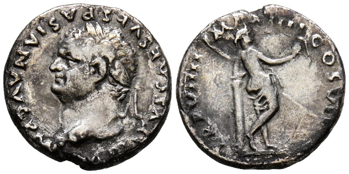 TITO. Denario. (Ar. 3,26g/17mm). 79 d.C. Roma. (RIC 16). Anv: Cabeza laureada de Tito a izquierda, alrededor leyenda: IMP TITVS CAES VESPASIAN AVG P M. Rev: Venus estante a derecha de espaldas portando casco y lanza apoyada sobre columna, alrededor leyenda: TR P VIIII IMP XIIII COS VII. MBC.