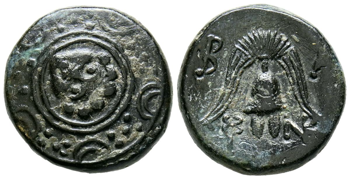REINADO DE MACEDONIA, Alejandro III el Grande. Ae16. (Ae. 3,85g/16mm). 323-315 a.C. Salamis. (Price 3162). Anv: Escudo macedonio con cabeza de Górogola. Rev: Casco con cresta, entre letras. MBC.