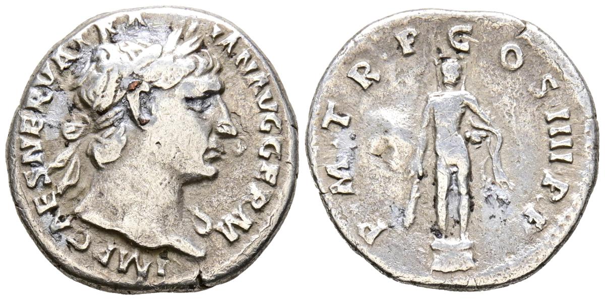 TRAJANO. Denario. (Ar. 3,14g/18mm). 100 d.C. Roma. (RIC 32). Anv: Cabeza laureada de Trajano a derecha, alrededor leyenda: IMP CAES NERVA TRAIAN AVG GERM. Rev: Hérucles estante sobre pedestal portando mazo, alrededor leyenda: P M TR P COS III P P. MBC.