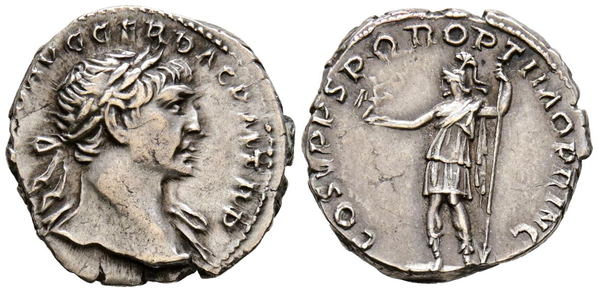 TRAJANO. Denario. (Ar. 3,48g/18mm). 107-110 d.C. Roma. (RIC 115 var). Anv: Busto laureado de Trajano con drapeado en hombro izquierdo, alrededor leyenda: IMP TRAIANO AVG GER DAC P M TR P. Rev: Roma estante a izquierda portando Victoria con corona de laurel y lanza, alrededor leyenda: COS V P P SPQR OPTIMO PRINC. MBC+. Descentrado.