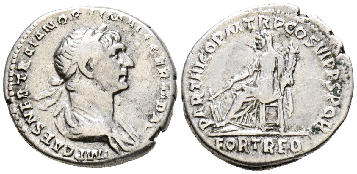 TRAJANO. Denario. (Ar. 3,23g/19mm). 116-117 d.C. Roma. (RIC 315). Anv: Busto laureado y drapeado de Trajano a derecha, alrededor leyenda: IMP CAES NER TRAIAN OPTIM AVG GERM DAC. Rev: Fortuna sentada a izquierda portando timón y cornucopia, en exergo: FORT RED, alrededor leyenda: PARTHICO P M TR P COS VI P P SPQR. MBC-.